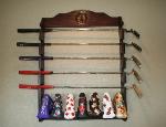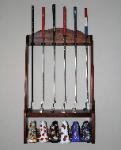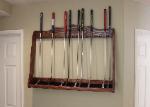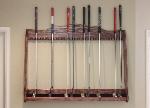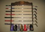 | Vertical wall mounted 41 Putter 27 headcover rack Made from solid exotic Bubinga wood. This awesome rack is 7 feet wide! |